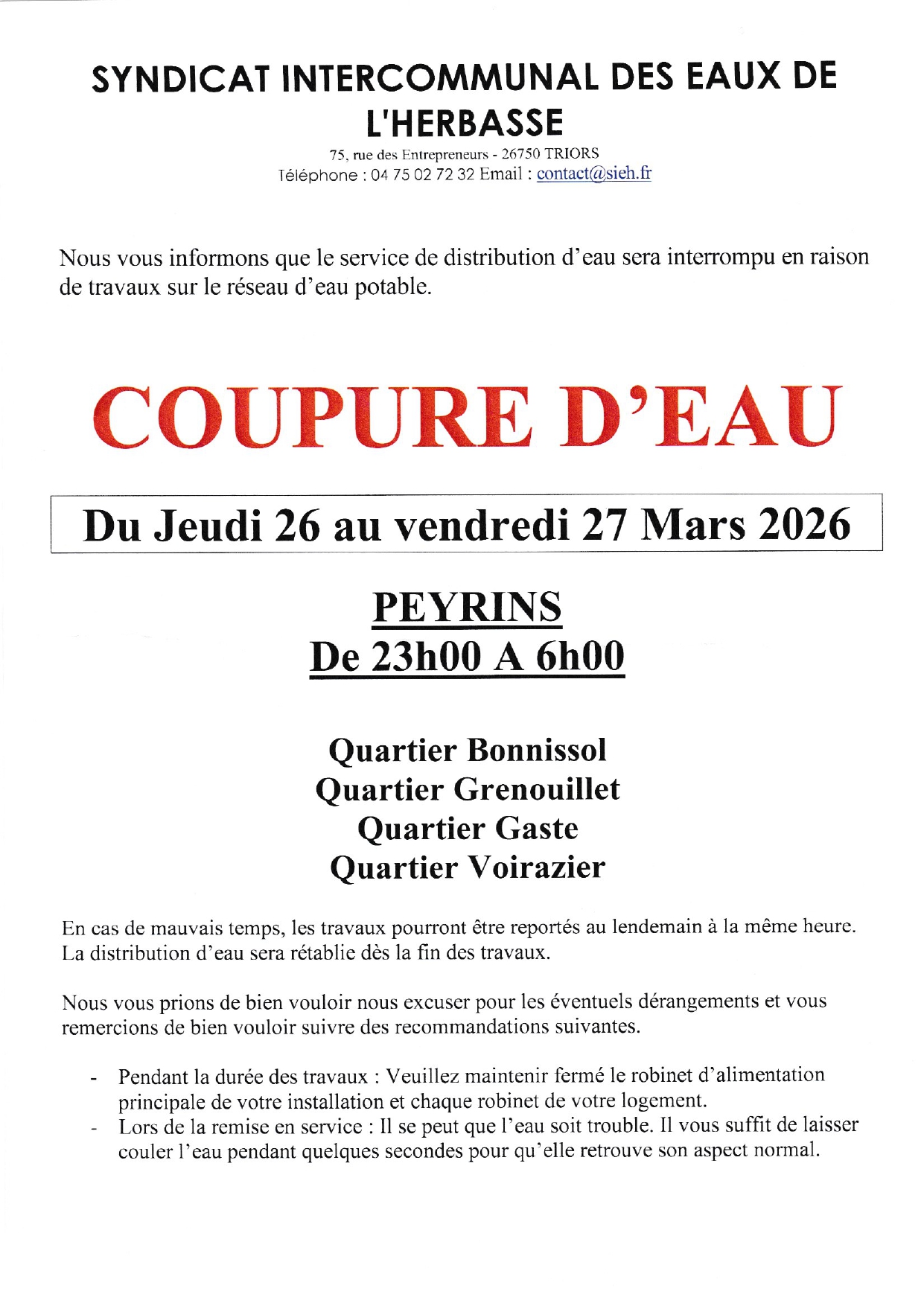 Coupure d’eau dans la nuit du 26 au 27 mars